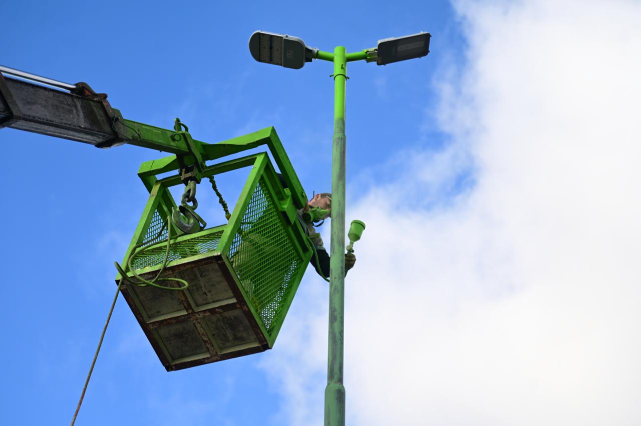 En una primera etapa, la cuadrilla a cargo de la Dirección de Energías comenzó a trabajar en las 300 columnas del Acceso Sur, las cuales fueron lijadas y pintadas con hidroesmalte al agua sin uso de solventes, la cual tiene 10 años de garantía.