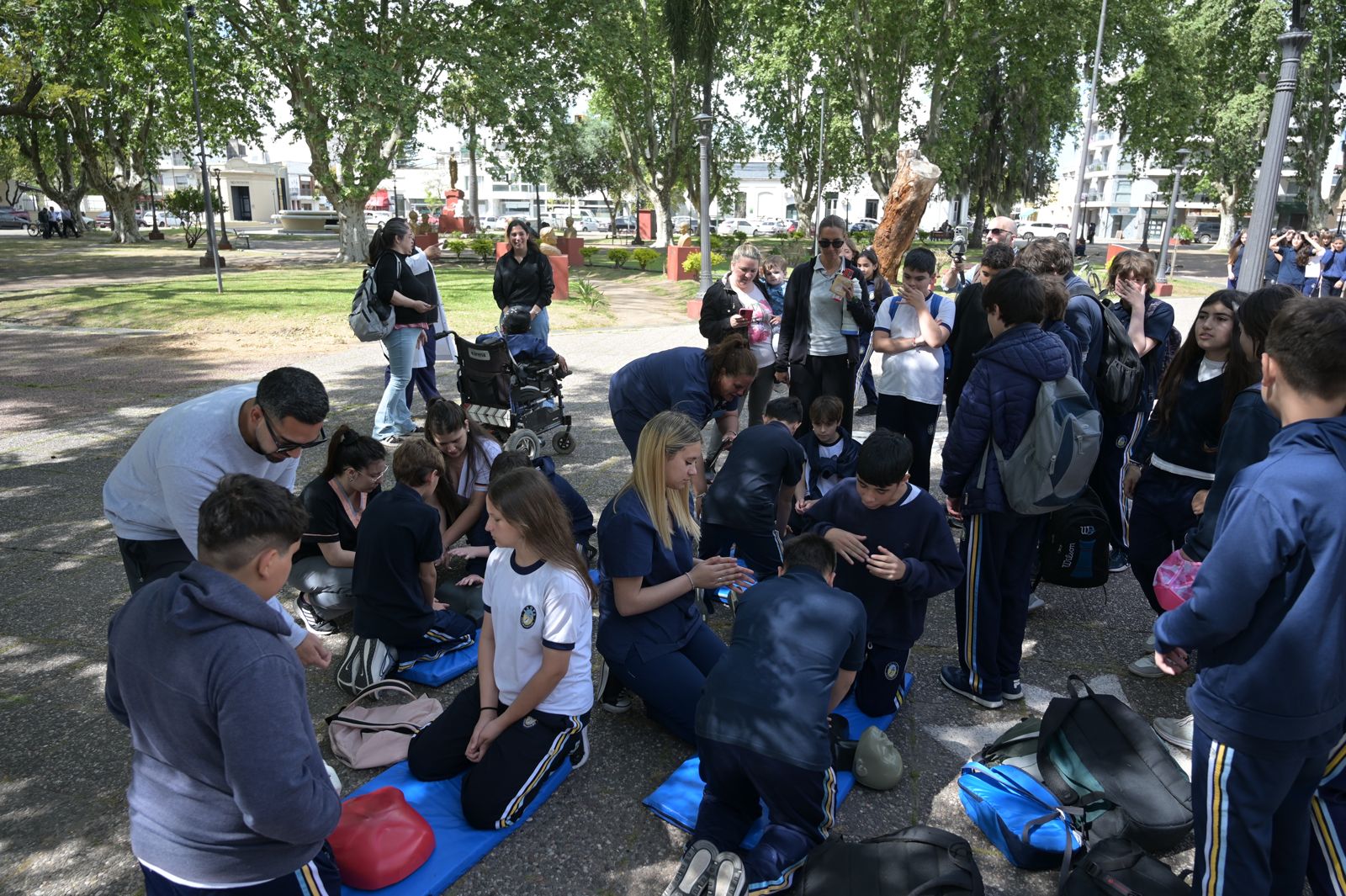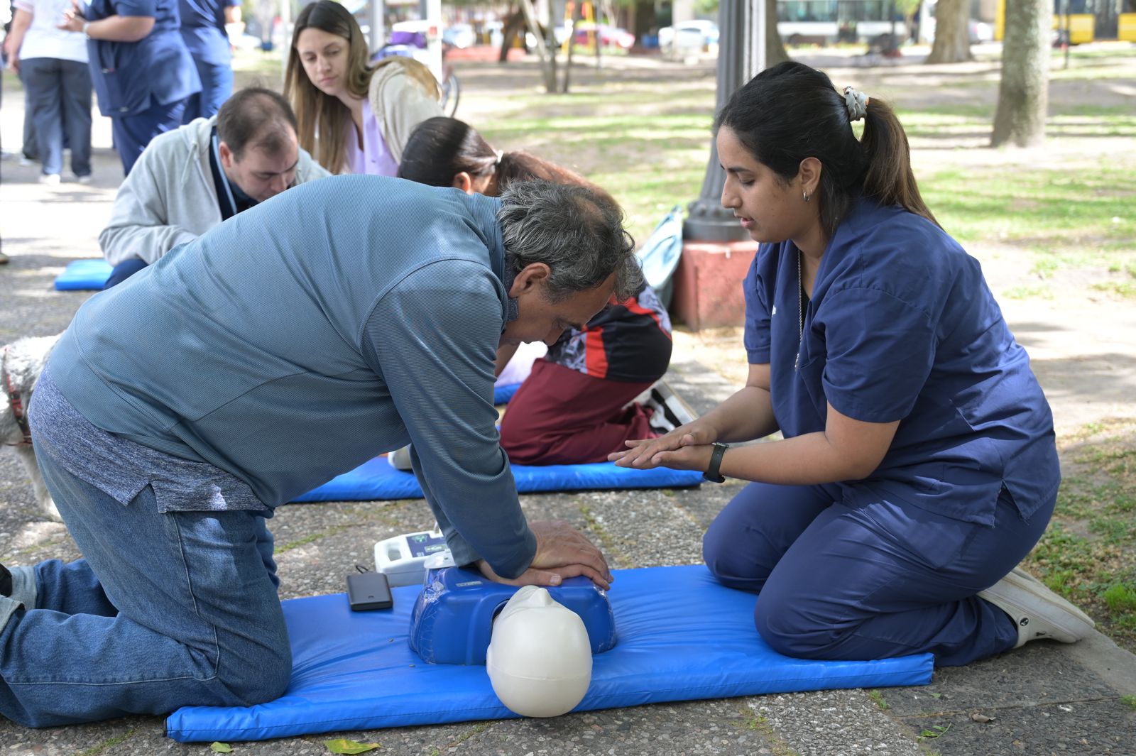 Una de las instancias más destacadas fue la capacitación en RCP y maniobra de Heimlich, a cargo del enfermero Luciano Gómez y profesionales de salud en articulación con estudiantes de la Tecnicatura Superior en Enfermería del Instituto María Inés Elizalde. Allí, los participantes pudieron aprender y practicar técnicas fundamentales para actuar en casos de emergencia, reforzando la importancia de contar con una comunidad entrenada y preparada.