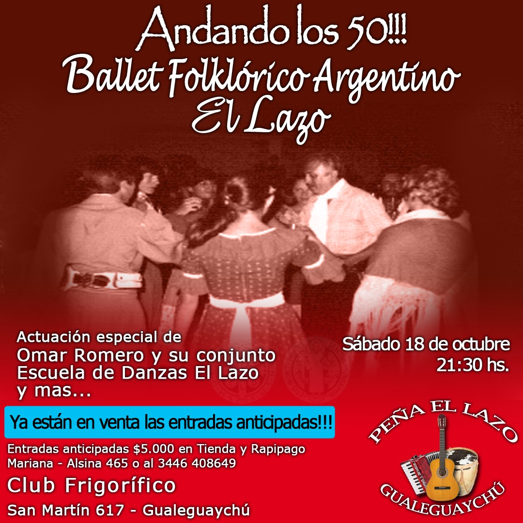 Ballet Folklórico Argentino El Lazo empieza a celebrar el recorrido de 50 años de actuaciones ininterrumpidas éste sábado 18 de octubre 21:30hs en el Club Frigorífico con una peña folklórica. Andando los 50!!!