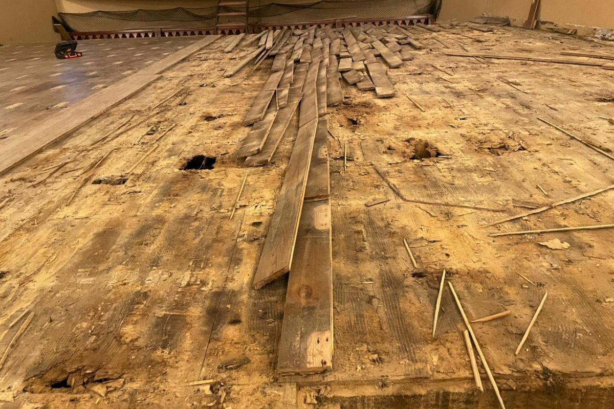 La intervención actual tiene como objetivo principal remover la totalidad de los tablones del piso, con la intención de conservarlos y reincorporarlos una vez finalizadas las obras de refacción. En esta primera etapa se avanza con la extracción de las tablas y del fenólico subyacente. Mientras que el fenólico será reemplazado, las maderas originales —en aproximadamente un 80%— serán cuidadosamente recuperadas.