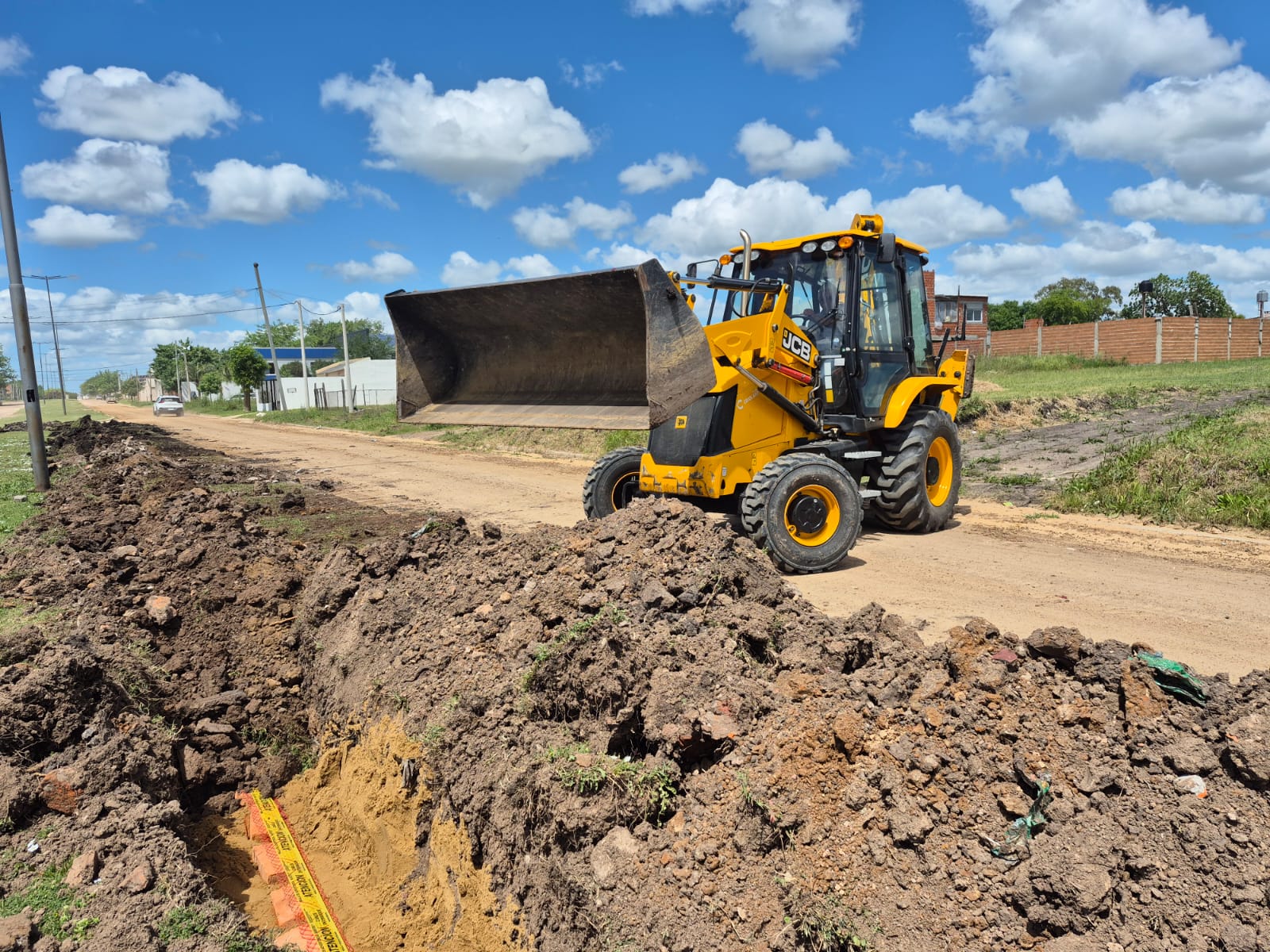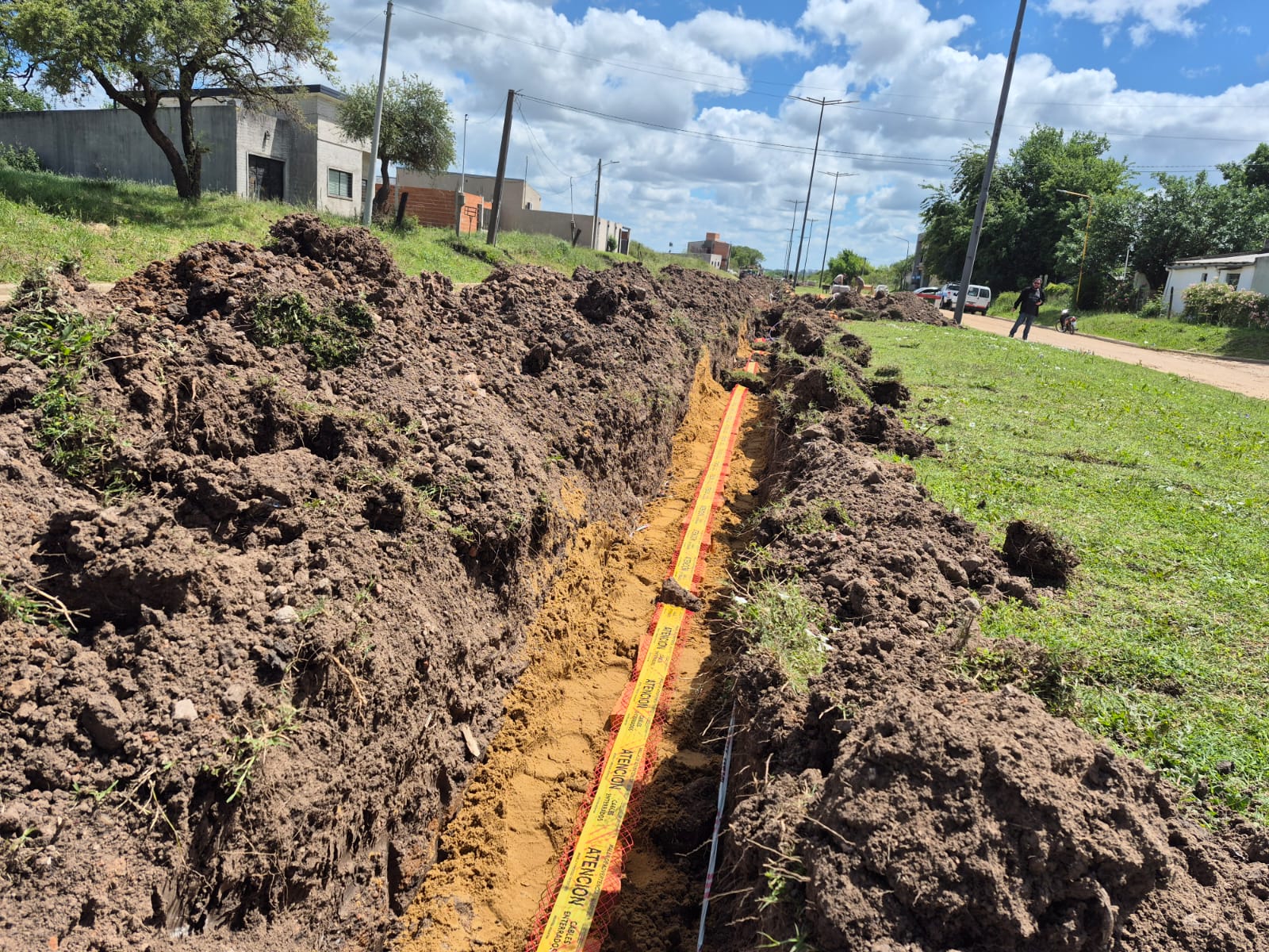 La intervención comenzó con la apertura de zanjas profundas a lo largo del cantero central, en las que se realiza la colocación de los conductores eléctricos subterráneos. Cada tramo de zanjeo es cuidadosamente rellenado con materiales seleccionados y protegido con cintas de señalización de seguridad, tal como lo indican las normativas técnicas vigentes. Este tipo de instalaciones garantiza mayor durabilidad, evita riesgos eléctricos y preserva la estética del entorno al eliminar el tendido aéreo tradicional.