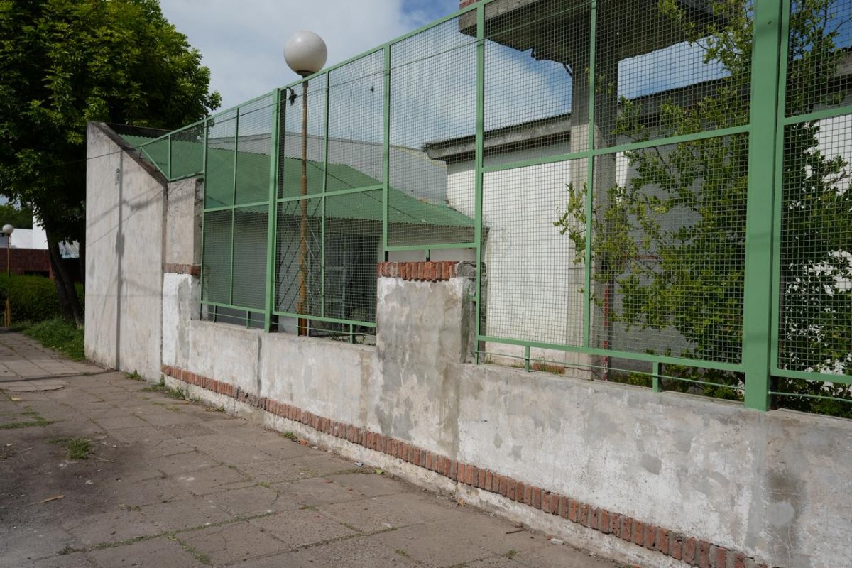 El frente del establecimiento cuenta con una pared dos alturas diferentes y encima una reja con malla sima fina, que se lavó para quitar hongos y se lijó en profundidad. Actualmente, la estructura recibe pintura de color verde para reforzar su protección y renovar la estética del ingreso.