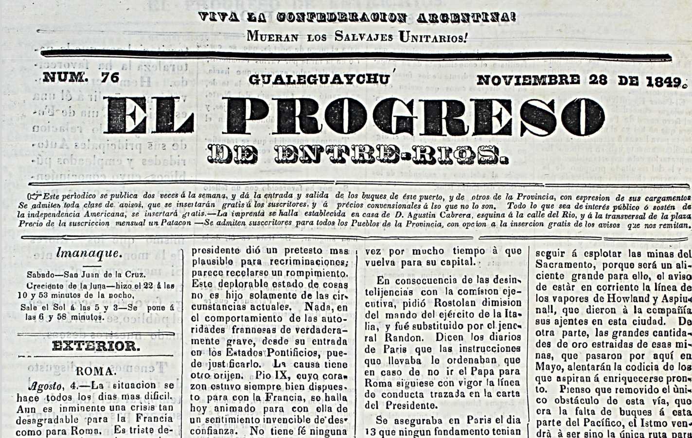 “Avisos Nuevos: EL PLANO y nomenclatura de las calles de esta Villa de Gualeguaychú acaba de publicarse por esta imprenta, y se halla à venta en ella à real cada uno”.