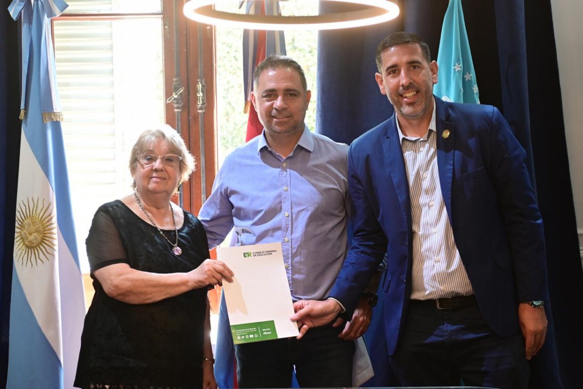 Esta mañana, en el Salón Azul del Palacio Municipal, el presidente del Consejo General de Educación, Carlos Cuenca, junto al intendente Mauricio Davico, entregó a la docente la Resolución que contiene su nombramiento.