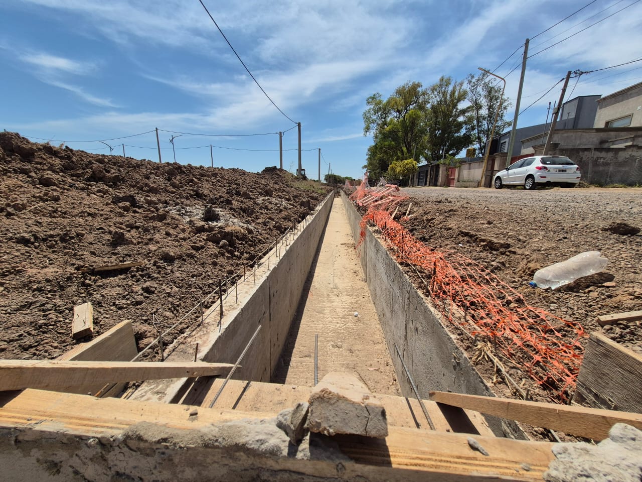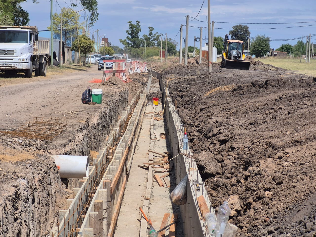 En el sector intervenido, el canal de hormigón armado ya cuenta con tramos estructurales ejecutados y otros en proceso de conformación, lo que permite avanzar en paralelo con las tareas de movimiento de suelo, nivelación y adecuación del terreno.