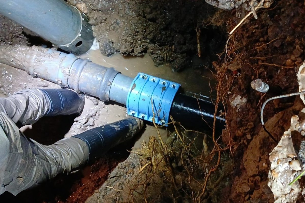 Una vez expuesto el tramo comprometido, la cuadrilla limpió la superficie y colocó una junta metálica de ajuste que abraza el cilindro en el punto dañado. El dispositivo cuenta con bulones laterales que, al ajustarse, ejercen presión mediante una goma interna que sella la filtración. Esta técnica evita reemplazos extensos y permite restituir el servicio con eficiencia y precisión.