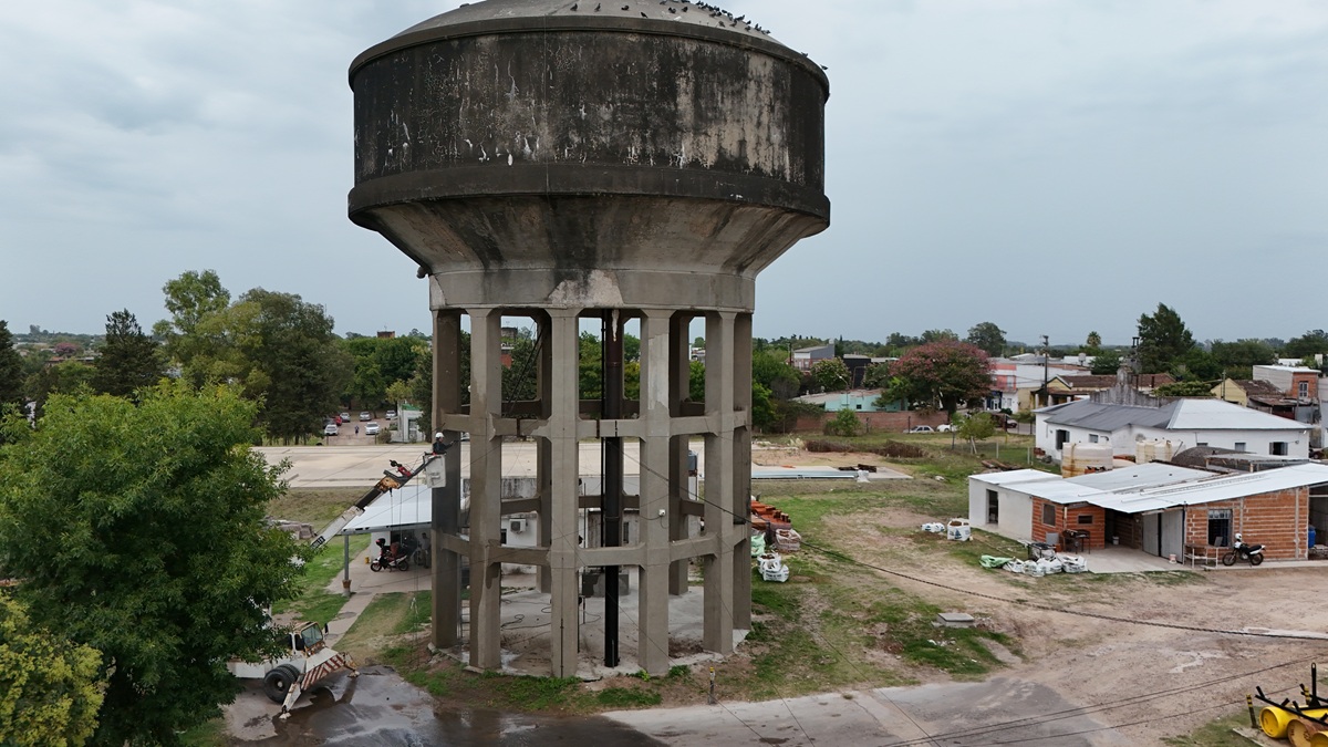 El tanque principal de Obras Sanitarias, emplazado en la planta potabilizadora de Gualeguaychú, atraviesa una intervención destinada a recuperar condiciones estructurales y sanitarias básicas de un elemento que ya es un sello distintivo de la Dirección encargada de la distribución de agua potable en la ciudad.