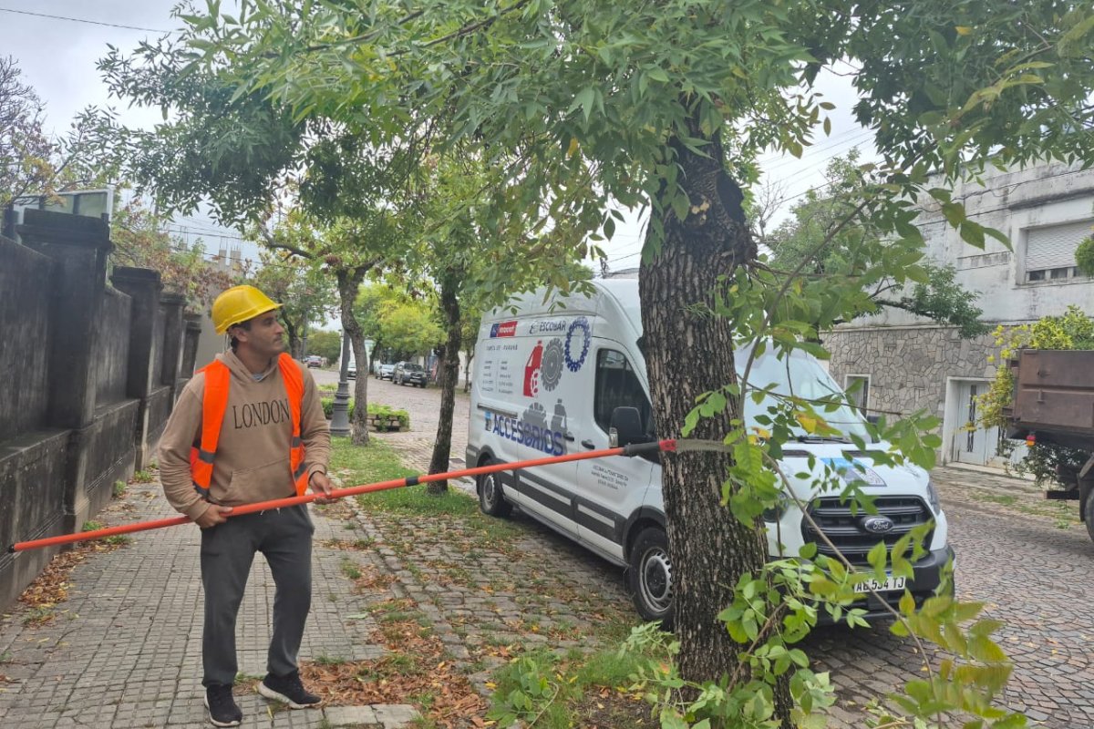 El trabajo sobre el arbolado incluyó una poda de media altura en ejemplares distribuidos a lo largo de todo el paseo, con cortes controlados orientados a mejorar la estructura de copa, liberar interferencias con luminarias y fachadas, y garantizar condiciones de seguridad para peatones y tránsito vehicular, en una operatoria que requirió herramientas manuales y equipos de corte específicos.